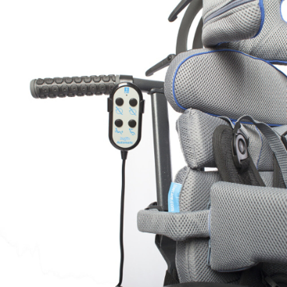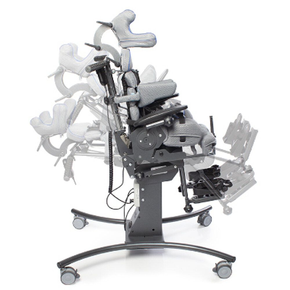 Ausilio multifunzionale per bambini e adolescenti. Il trasferimento può essere effettuato in posizione seduta, evitando così l'uso di un sollevatore. La funzione sdraiata o eretta desiderata può essere regolata elettricamente in modo continuo. Lo schienale "Second Spine" è anatomicamente modellabile.