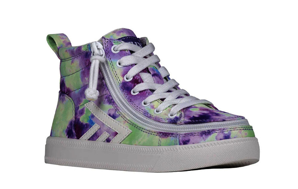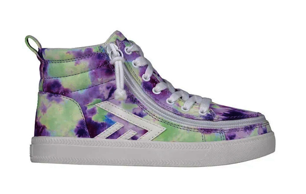 Le High Tops BILLY CS in acquerello viola uniscono nostalgia e stile moderno. Con lacci funzionali, solette estraibili e chiusura a zip, offrono un comfort perfetto e una vestibilità personalizzata.