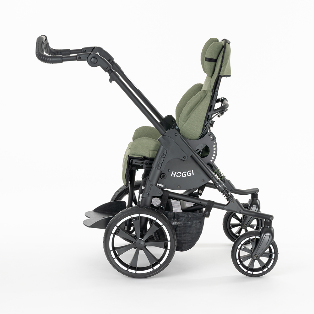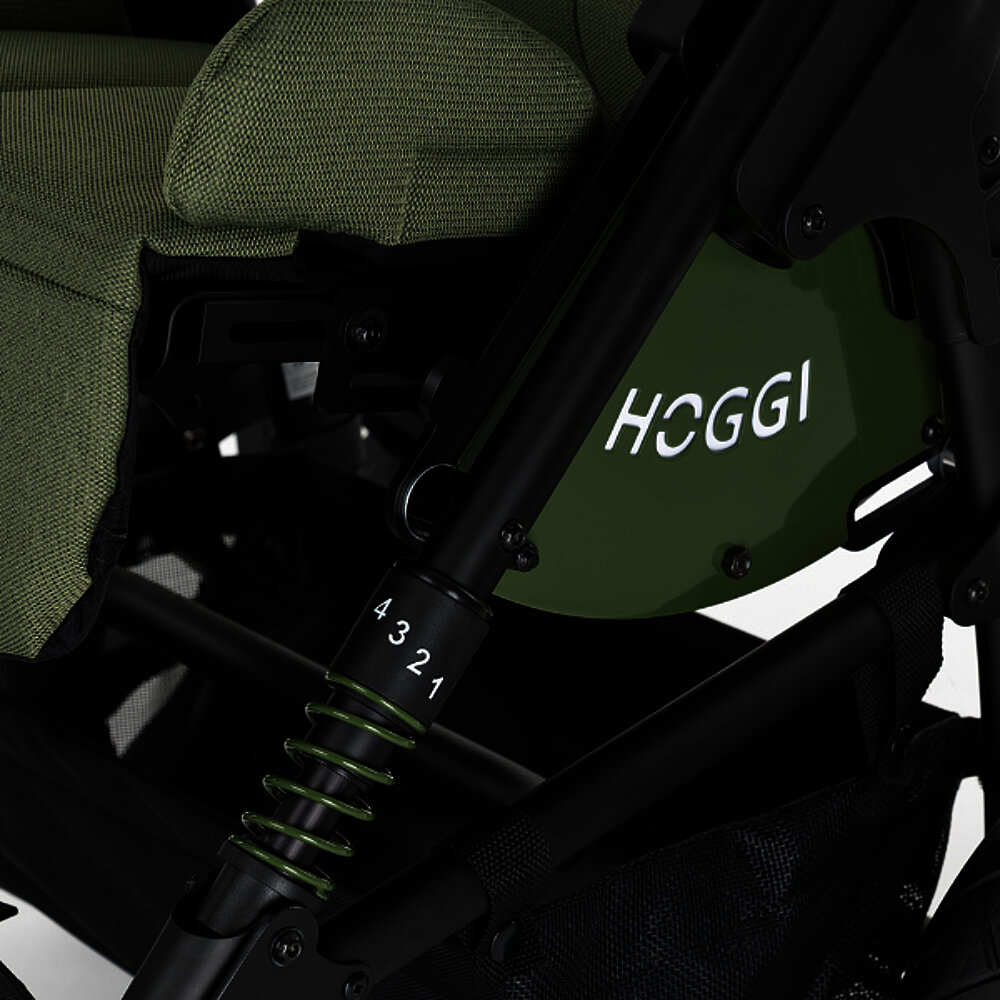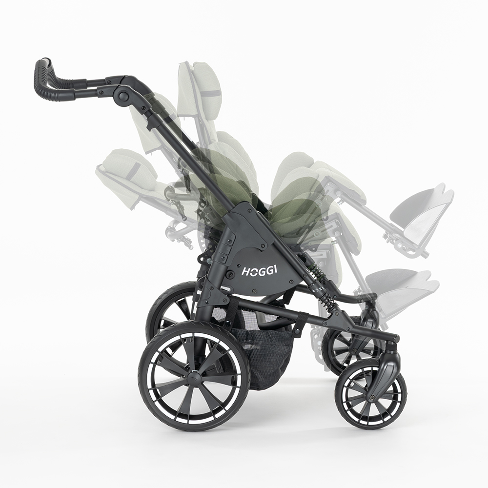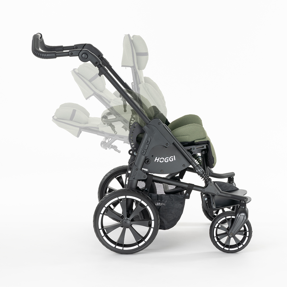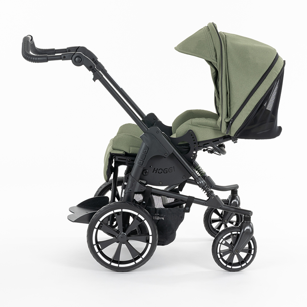 La combinazione di telaio nero opaco e imbottitura verde canna è armoniosamente completata da un nuovo tettuccio di alta qualità (con protezione UV 50+, circolazione dell’aria e ampia finestra di visione) nello stesso colore dell’imbottitura.
