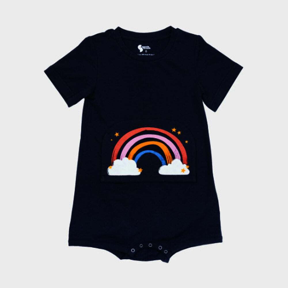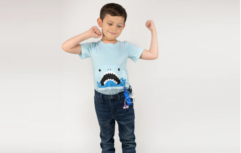 Body per bambini disabili con apertura a zip sulla parte anteriore dell'addome per accedere a tubi di alimentazione, stoma e altro.