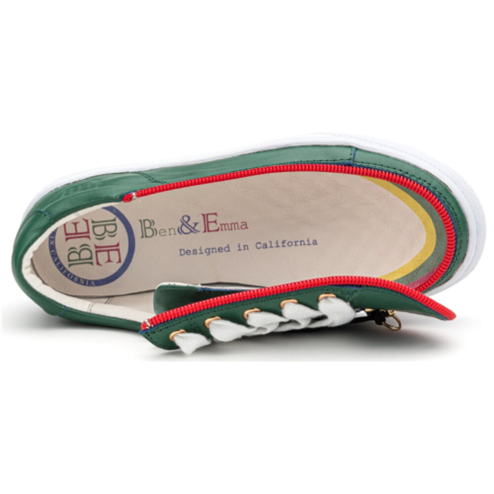 Le moderne e innovative scarpe Ben&Emma, progettate in California, sono dotate di una cerniera che permette ai bambini di aprire la scarpa quasi completamente dalla parte anteriore. Non è più necessario spingere il piede all'interno: ora possono infilarlo facilmente e comodamente. Basta chiudere la cerniera una volta e sono pronte per l'uso: è così facile!