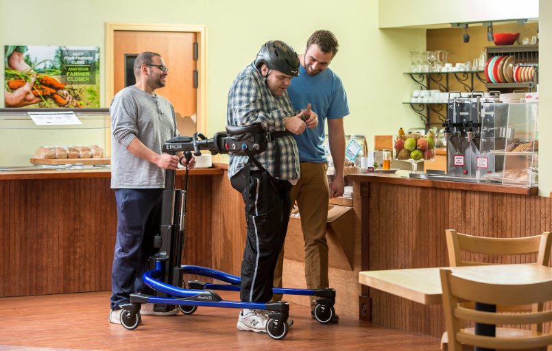 Hallo! Wir hatten den dynamic pacer zur Probe für eine Woche bei uns. Unsere Tochter steht aktuell nur passiv und somit war das Gehgerät eine große Hilfe im Alltag. Man kann auch in die andere Richtung gesetzt stehen und somit ist das Gestell nicht im Weg und man kommt problemlos an andere Gegenstände ran. Zum Beispiel direkt vor den Spiegel zu stehen oder wenn ich meiner Tochter die Zähne geputzt hatte. Diese Funktion fanden wir super, um sie noch besser und näher im Alltag zu integrieren. Die Rumpfhalterung ist vom Winkel her verstellbar und somit eben gut vorwärts und rückwärts verwendbar. Der Fangsitz war gerade für den Anfang gut. Er kann auch abgenommen werden. Wir hatten die Version für den Innenbereich. Es gibt ebenfalls eine für außen mit größeren Rädern. Diese Variante würde uns noch besser zusagen. Das Gehgerät ist auch gut tragbar, da es nicht schwer ist. Wir waren sehr zufrieden.