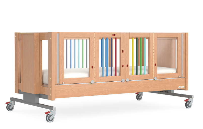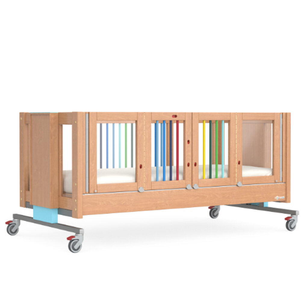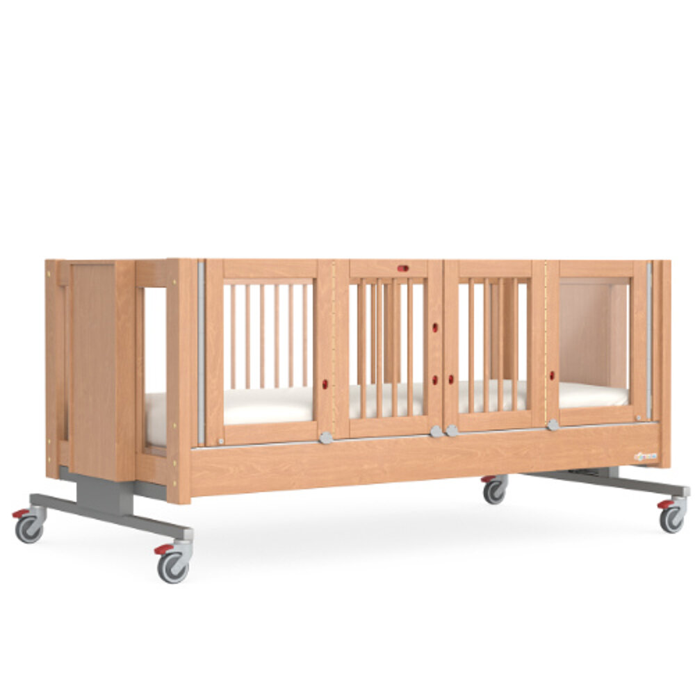 Il KayserBett EMMA 1 è adatto a bambini e adolescenti con varie disabilità e offre anche opzioni di cura ottimali per le persone in sedia a rotelle grazie alla sua accessibilità di 66 cm. Grazie al montaggio parziale con lastre di vetro acrilico, i bambini possono partecipare attivamente all'ambiente. Il KayserBett EMMA 1 ha porte alte 60 cm, a scelta su uno o entrambi i lati lunghi. Questo protegge i bambini con capacità motorie irrequiete dall'entrare e uscire dal letto senza supervisione. Una speciale chiusura impedisce l'apertura delle porte dall'interno. Grazie alla regolazione in altezza da 45 cm a 105 cm (bordo superiore del materasso), il KayserBett EMMA 1 è ideale per la cura e la terapia ed è sempre ergonomico. Il KayserBett EMMA 1 può essere spinto sotto, in modo da poter utilizzare anche i sollevatori.