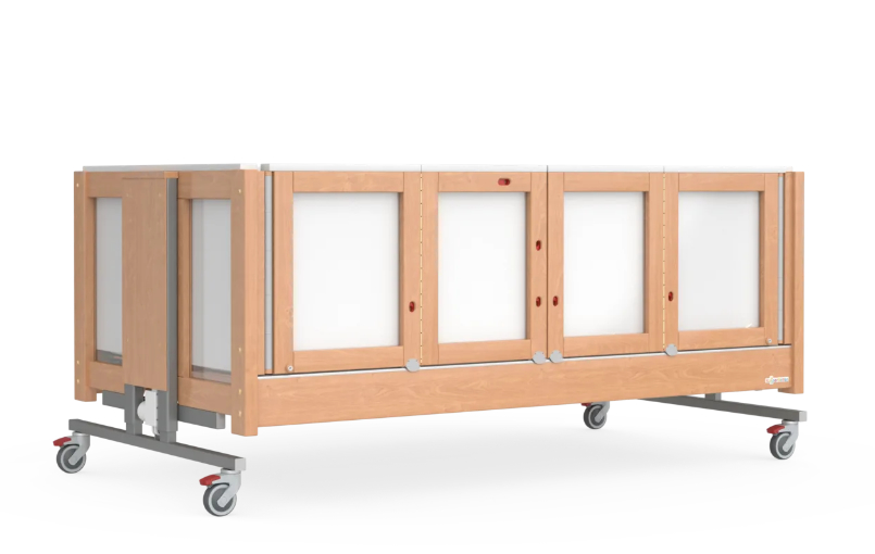 La protezione integrale di 60 cm con imbottitura integrata permanente di 6 cm di spessore offre una protezione affidabile contro i movimenti involontari senza limitare le dimensioni interne. Il piano di riposo a quattro sezioni, le porte laterali completamente apribili e la regolazione dell'altezza fino a 50 cm consentono un posizionamento ottimale e facilitano l'assistenza quotidiana, sempre con l'obiettivo di coniugare al meglio sicurezza e qualità della vita.
