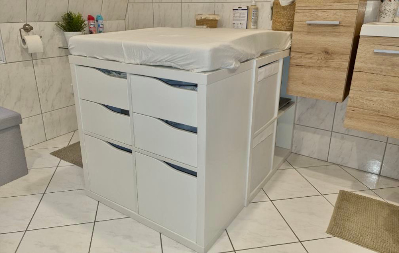 Für uns die beste Lösung. Waschbecken und Badewanne in unmittelbarer Nähe. Alles ist griffbereit und bietet viel Stauraum für IKM, Badetücher, usw. Und wenn unsere Maus größer wird, lässt es sich in der Länge ja erweitern.