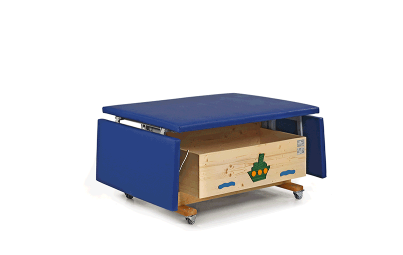 Il vano integrato consente di riporre coperte e materiali terapeutici. Il design accogliente e la superficie disinfettabile rendono Felix a adatto all’uso quotidiano.