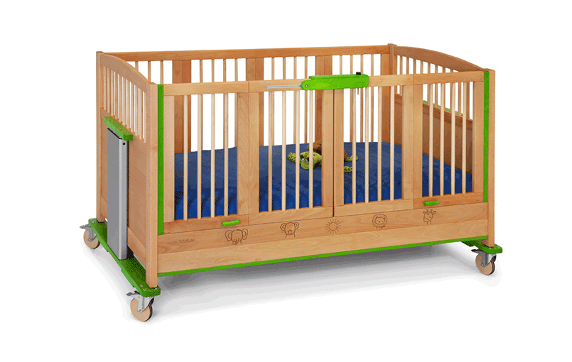 Il letto di cura Knut (b) è caratterizzato da un'altezza della sponda laterale di 78 cm. Come tutti i letti di questa gamma, è dotato di una pratica porta a quattro ante pieghevoli/scorrevoli. Su richiesta, è possibile installare sponde laterali regolabili elettricamente per fornire un ulteriore sollievo nell'assistenza quotidiana. Un'altra nuova opzione è la sponda laterale "a scomparsa", che si nasconde nel letto. Questo vi offre ancora più flessibilità e comfort nell'assistenza al vostro bambino. Il letto di cura Knut (b) offre quindi un'ampia gamma di opzioni per ottimizzare la situazione di cura e soddisfare le esigenze del bambino.