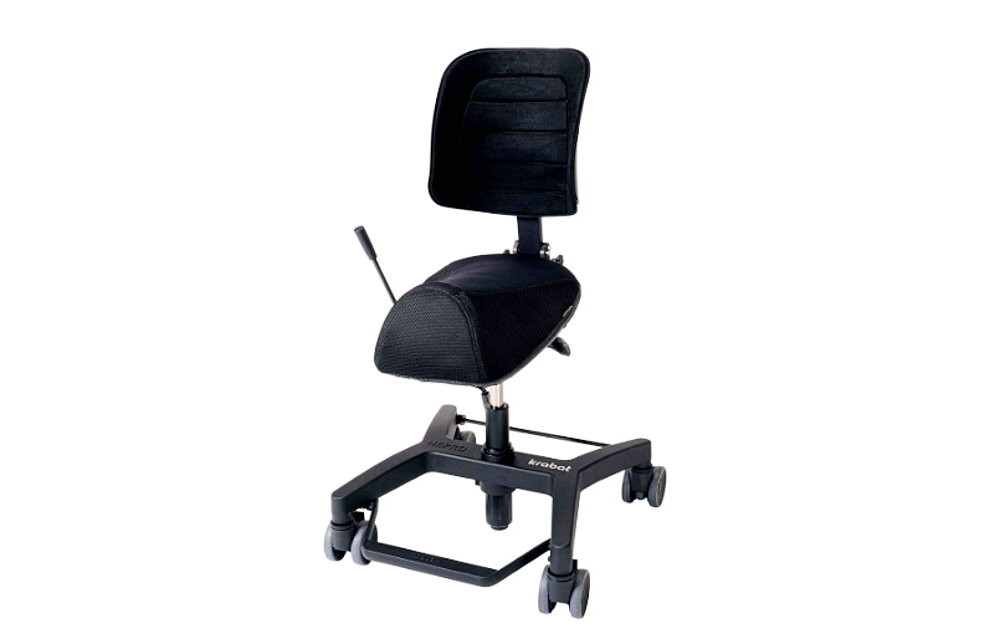 Krabat Jockey Basic è una sedia attiva con sedile a sella particolarmente facile da usare. La struttura di base è disponibile in due versioni: con regolazione manuale o elettrica dell'altezza del sedile. Il sedile e lo schienale sono disponibili in due diverse misure e possono essere personalizzati.