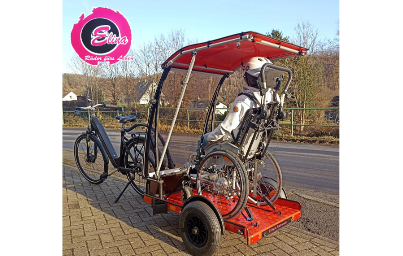 Bisher fährt unser Zugfahrzeug noch allein mit Mamas Muskelkraft, wobei da langsam eine Grenze erreicht wird und wir demnächst ein E-Bike ergänzen werden (Anhänger, Rollstuhl und Kind bringen es zusammen auf ca. 70kg, was bergauf für strammes Training sorgt).