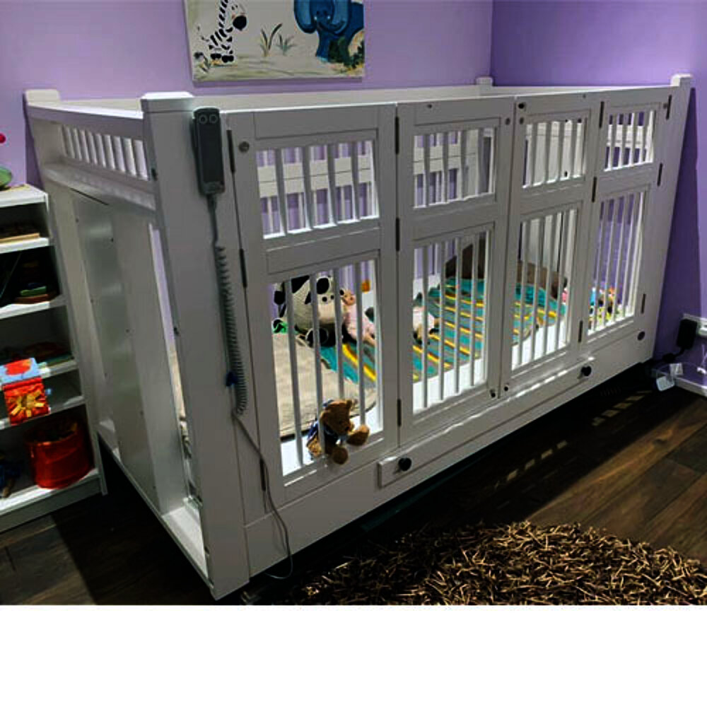 Un letto che offre un ambiente sicuro e protetto con diverse altezze del telaio e favorisce la mobilità del bambino. Nella versione "accesso basso" con solo 20 cm di bordo superiore del materasso e 32 cm nella versione standard, questo letto consente al bambino la massima indipendenza e la necessaria sicurezza durante il sonno. L'altezza per la terapia e la cura varia da 90 cm a 102 cm a seconda del modello. Che si tratti di barre o di vetro acrilico, di applicazioni di colore, naturale puro o completamente laccato, non ci sono limiti alla vostra immaginazione. La regolazione elettrica della sezione testa e piedi offre ulteriori opzioni di posizionamento. Questa opzione può essere abbinata solo a ruote con freno per "accesso basso".