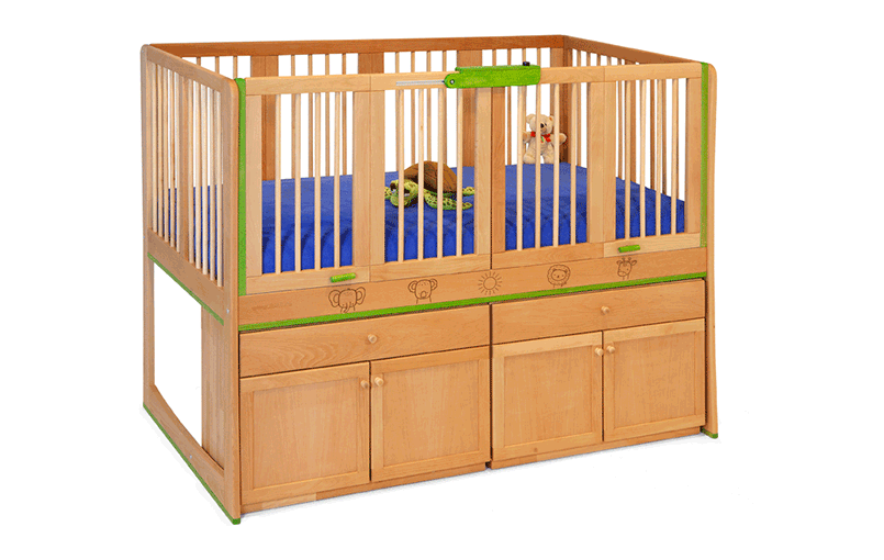 Superficie in legno a norma (DIN 71-3), protezione contro l’umidità e colori personalizzabili rendono Lola adatta a sonno, gioco, assistenza e terapia.