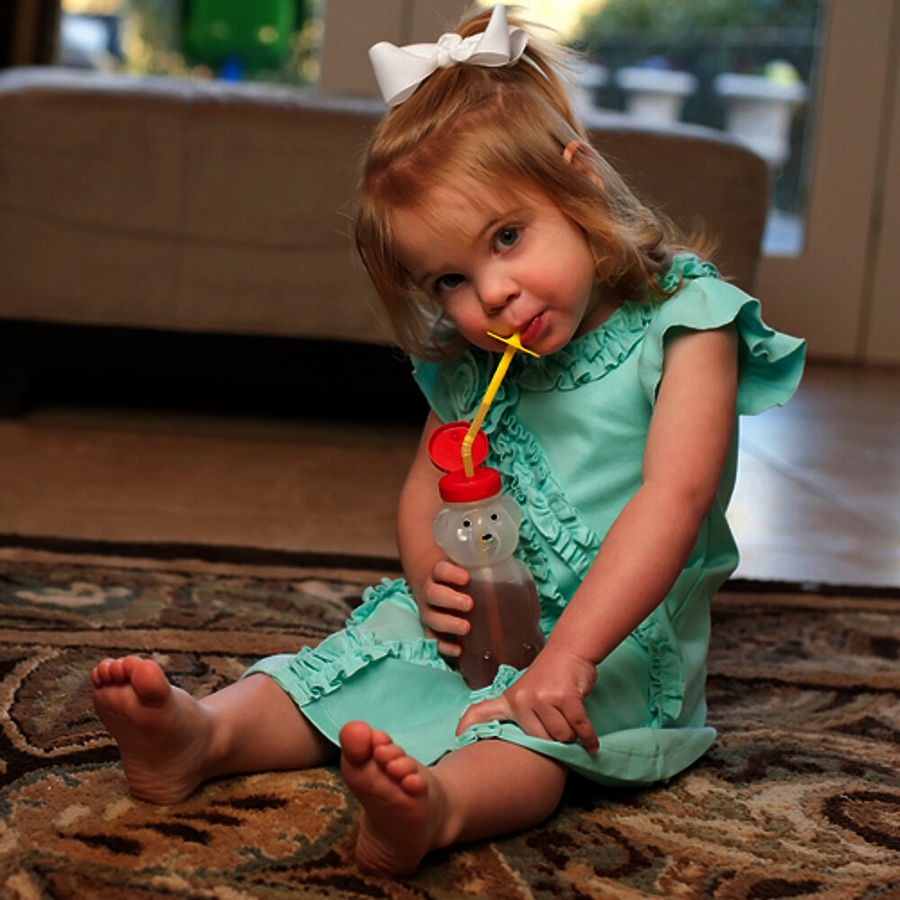 Doch Felix hat es schnell verstanden, wie er etwas aus dem Bären raus bekommt. Durch seinen schlechten Mundschluss läuft zwar immer noch etwas nebenher, aber die Babyflasche ist schon mal vom Esstisch weg.