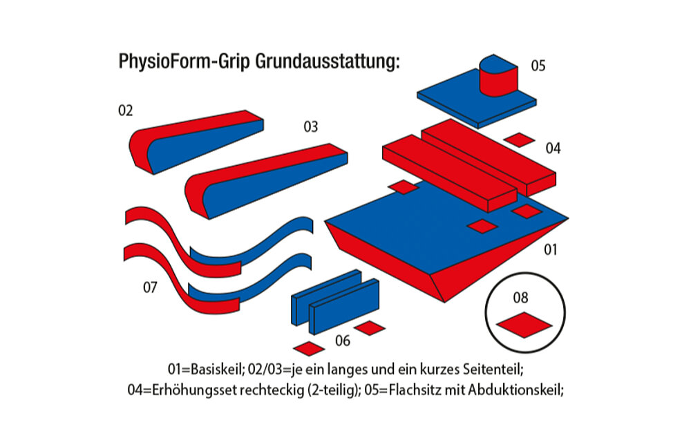 L'attrezzatura di base PhysioForm-Grip offre tutte le parti necessarie per il posizionamento addominale, laterale, posteriore e la posizione seduta dei bambini più piccoli. Se necessario, è possibile aggiungere altre parti dalla gamma di accessori. Le illustrazioni associate facilitano la comprensione dei possibili usi e applicazioni.