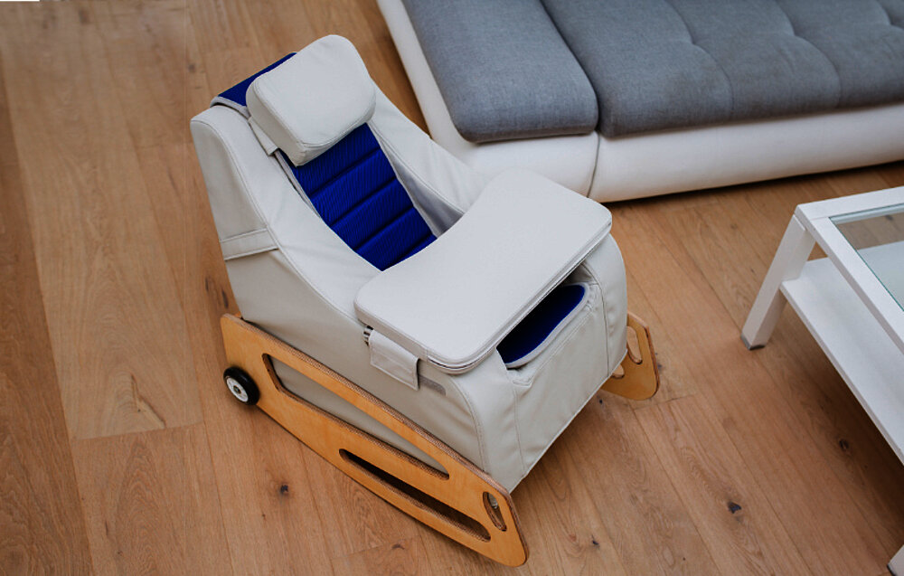 La Gravity Chair è un sistema di supporto gravitazionale personalizzato. Sembra una normale poltrona, ma offre un sostegno unico. Il materiale espanso si adatta perfettamente al corpo e garantisce una posizione seduta stabile con un centro di gravità basso. Il sostegno ravvicinato del corpo e i braccioli alti aumentano ulteriormente la stabilità. La posizione rialzata delle braccia consente una migliore respirazione, che può portare a un maggiore contenuto di ossigeno nel sangue.