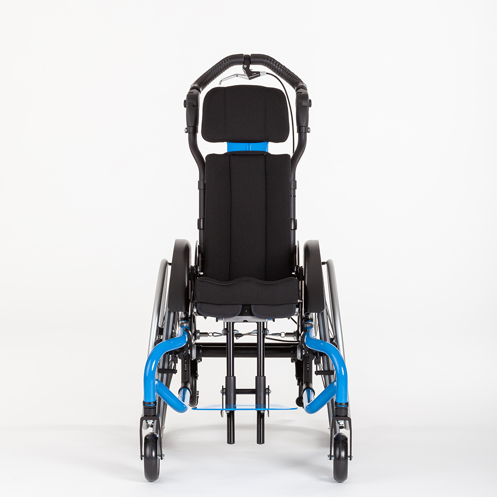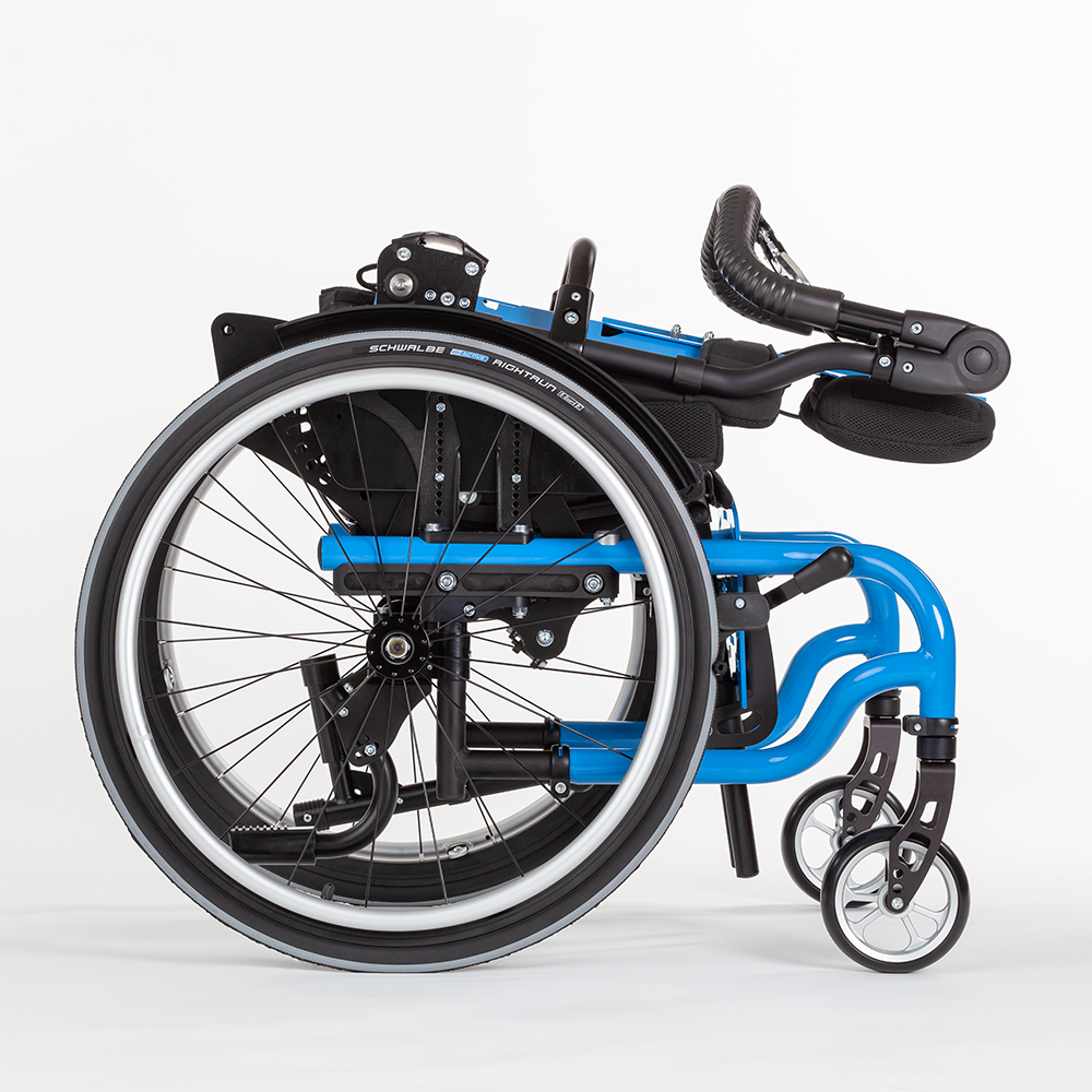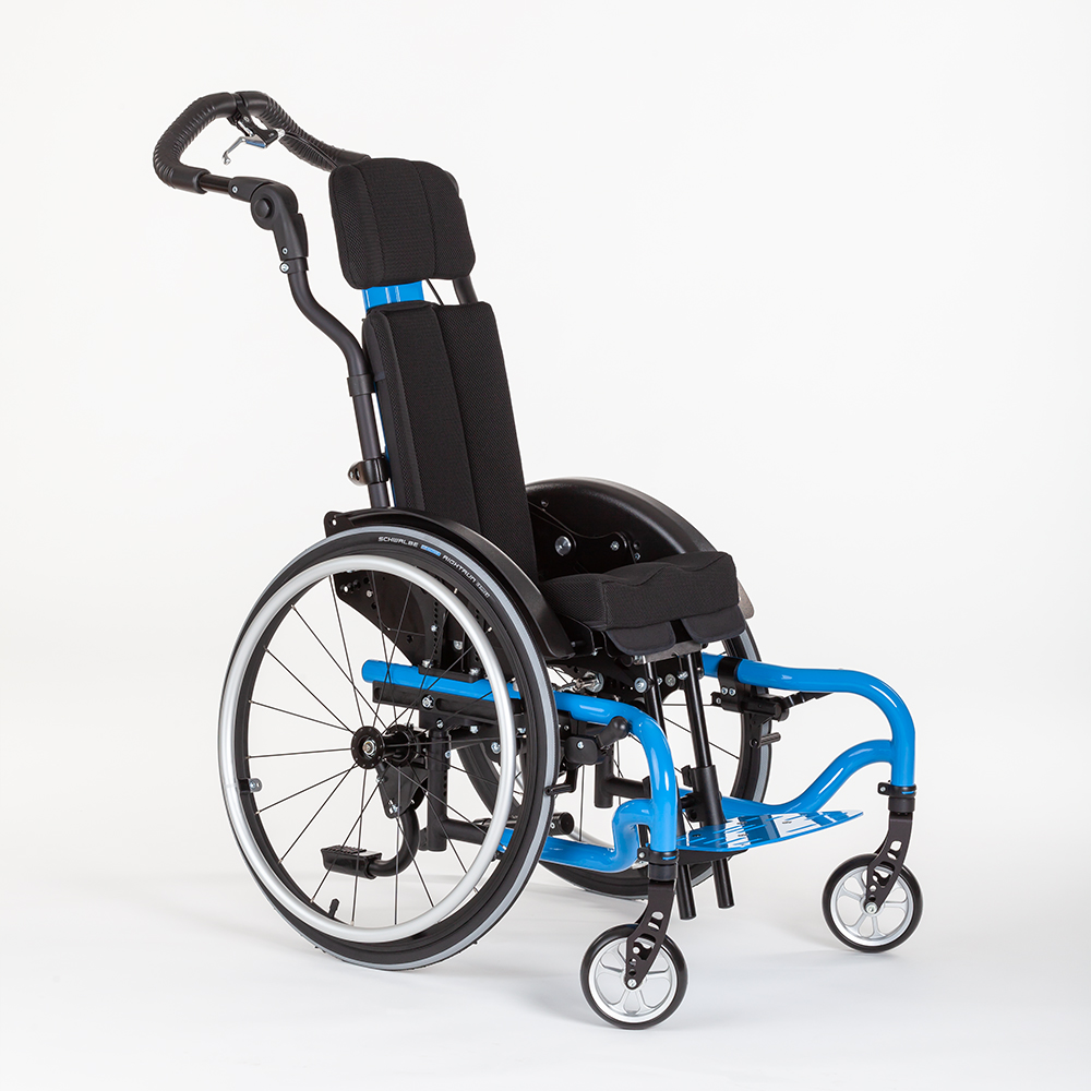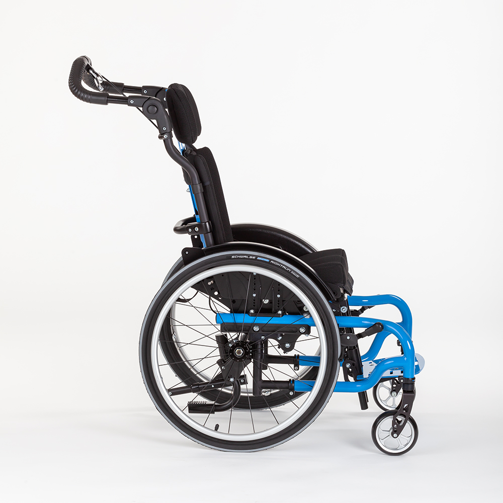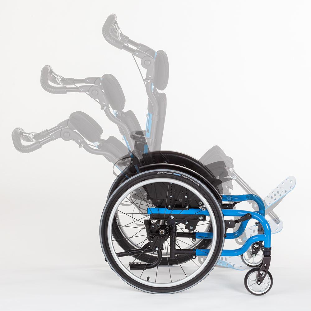 SWINGBO 2 è una carrozzina attiva per bambini e ragazzi con un'inclinazione del sedile di 45°. La nuova inclinazione del sedile consente una comoda inclinazione del centro di gravità. L'angolo di seduta può essere regolato da -5° a +45°. Il telaio è stato appositamente progettato in versione abduzione e garantisce una posizione di seduta permanentemente abdotta.