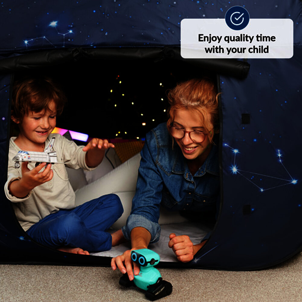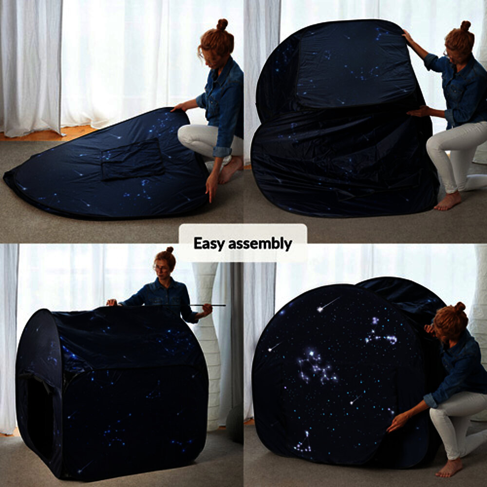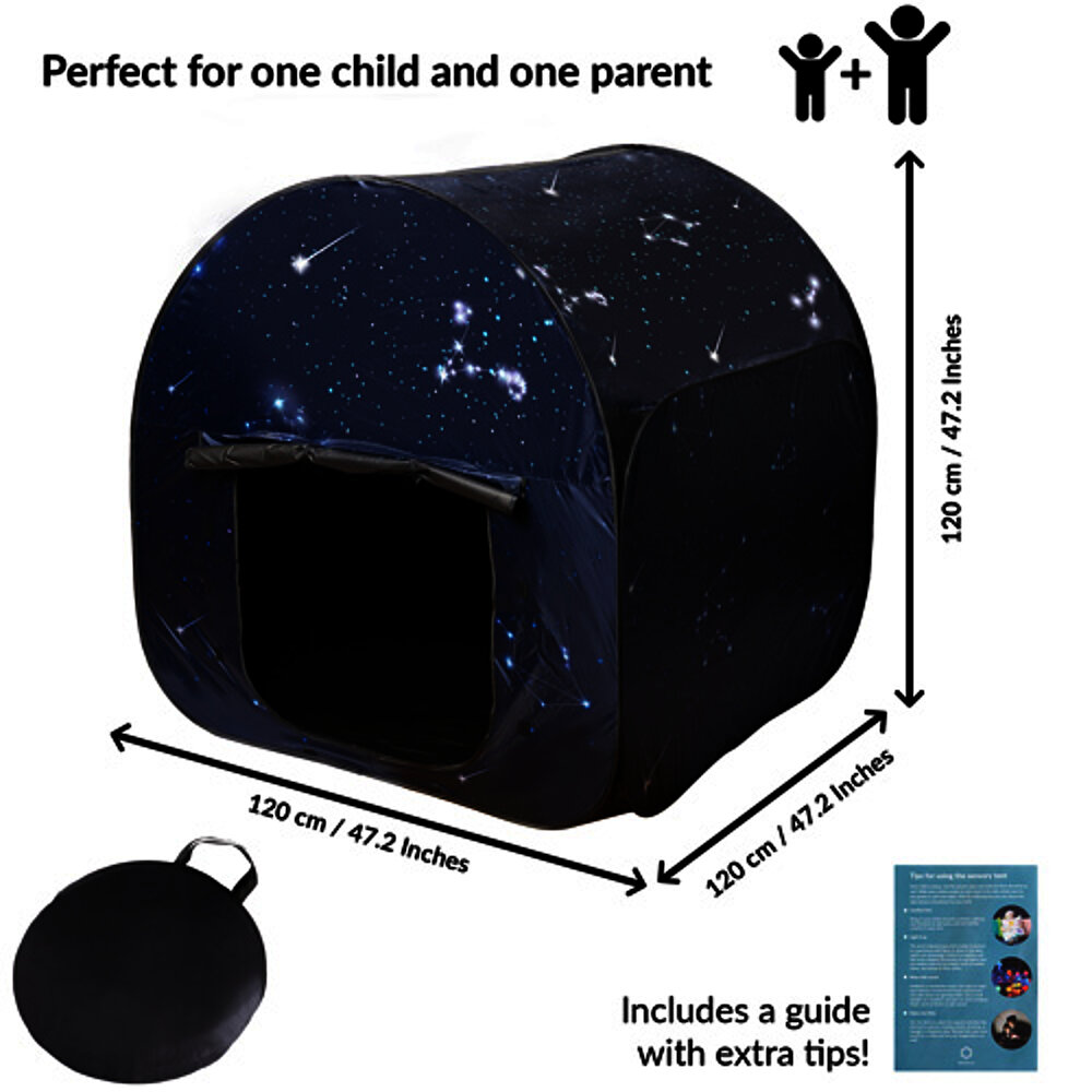 Angolo sensoriale per bambini: uno spazio tranquillo all'interno di uno spazio, ideale per giocare e rilassarsi. La tenda offre un ambiente sicuro ai bambini con esigenze particolari come SPD, autismo o problemi di concentrazione. Grazie all'effetto oscurante, è adatta anche ai giochi di luce e crea uno spazio separato per i sensi. Veloce da montare e portatile, è perfetta a casa o a scuola quando manca un rifugio separato.