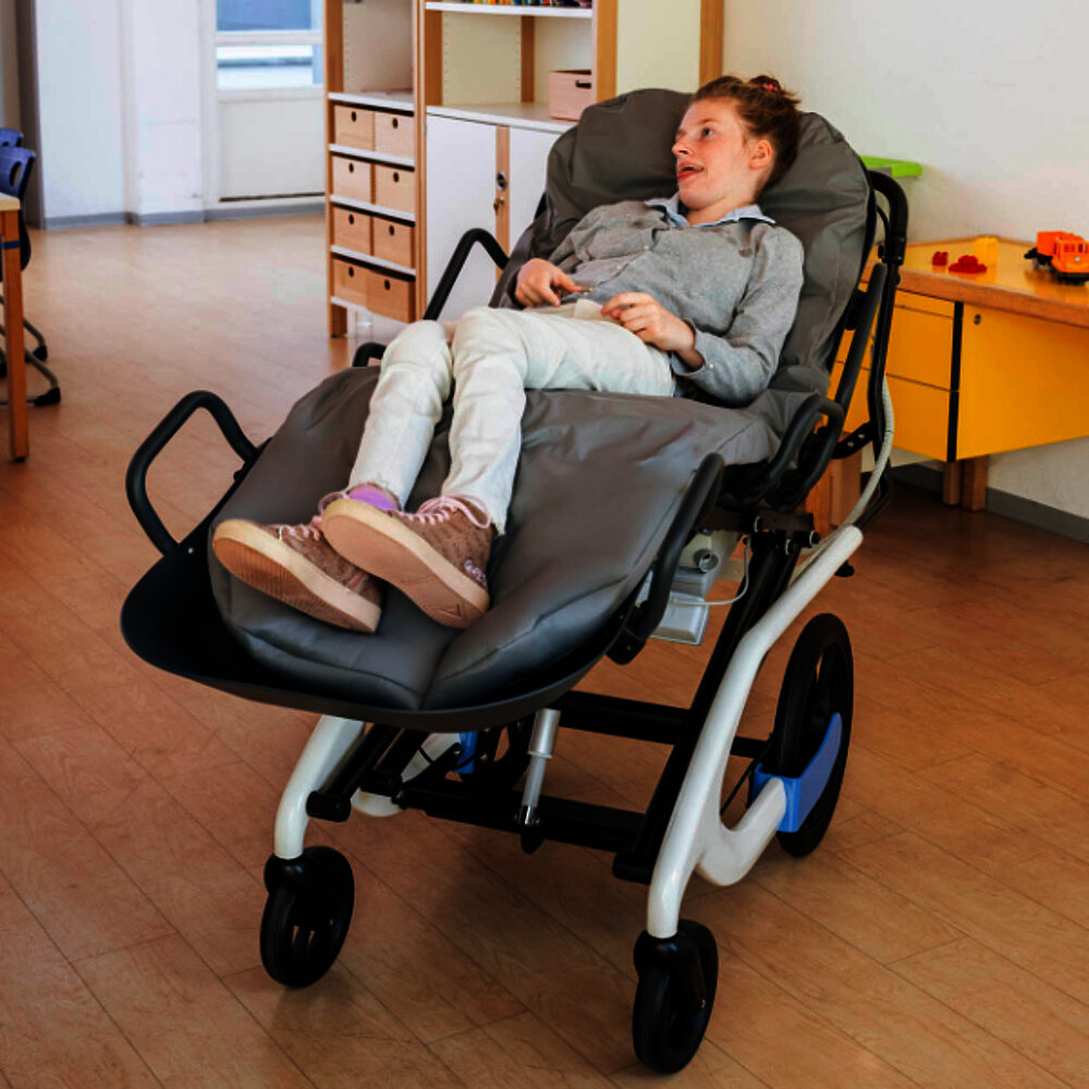tina. è un sistema modulare a guscio reclinabile che offre il massimo comfort. Grazie a un materasso a depressione con pompa elettrica, garantisce un riposo senza pressione e senza dolore. L'altezza della superficie di sdraio può essere regolata elettricamente, così come gli angoli del sedile, dello schienale e delle ginocchia, in modo da poter assumere una posizione confortevole anche da seduti. Le ruote flessibili e piroettanti facilitano la rotazione e la spinta, rendendo tina. particolarmente mobile, ideale per passeggiate e viaggi. Grazie al sedile regolabile in profondità, alla barra di spinta regolabile e alle robuste ruote posteriori in PU da 16", tina. offre un elevato livello di comfort e maneggevolezza sia all'interno che all'esterno.