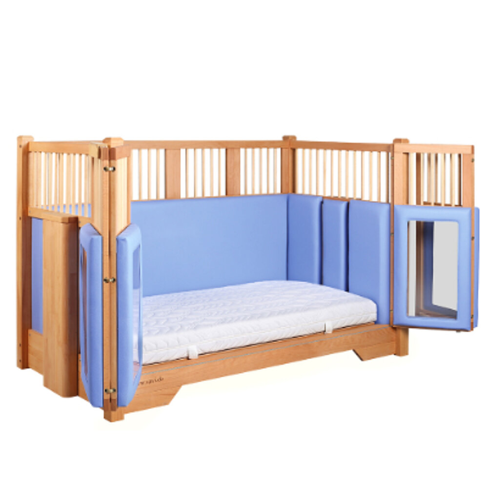 Il letto di cura per bambini Tom unisce funzionalità, sicurezza e un design accogliente in un concetto ben studiato. Dotato di una porta scorrevole pieghevole a quattro ante, sponde laterali robuste e regolazione flessibile in altezza, offre un supporto ottimale nella cura quotidiana e nelle situazioni terapeutiche.