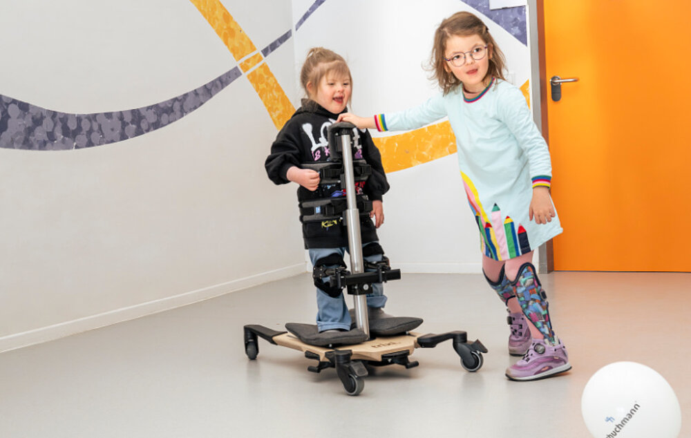 L'app stixi. App offre un divertimento e una motivazione maggiori quando si sta in piedi, registrando i tempi di permanenza in piedi e visualizzando i progressi in una curva di successo. Il modello base è disponibile in versione dinamica o rigida, a seconda delle esigenze, e può essere dotato di un gilet e di supporti pelvici e toracici per un sostegno supplementare. I supporti per le ginocchia regolabili tridimensionalmente offrono un'ampia superficie di appoggio che riduce la pressione in qualsiasi posizione e, insieme al supporto pelvico, garantiscono una sensazione di sicurezza. Le rotelle con bloccaggio totale consentono un ingresso e un'uscita sicuri, in quanto impediscono il rotolamento involontario. Il lettino terapeutico offre un'ampia gamma di utilizzi terapeutici e ludici, mentre i bordi per i talloni offrono un ulteriore sostegno da dietro.