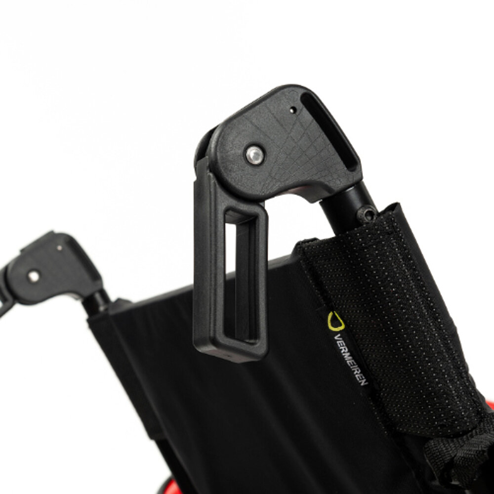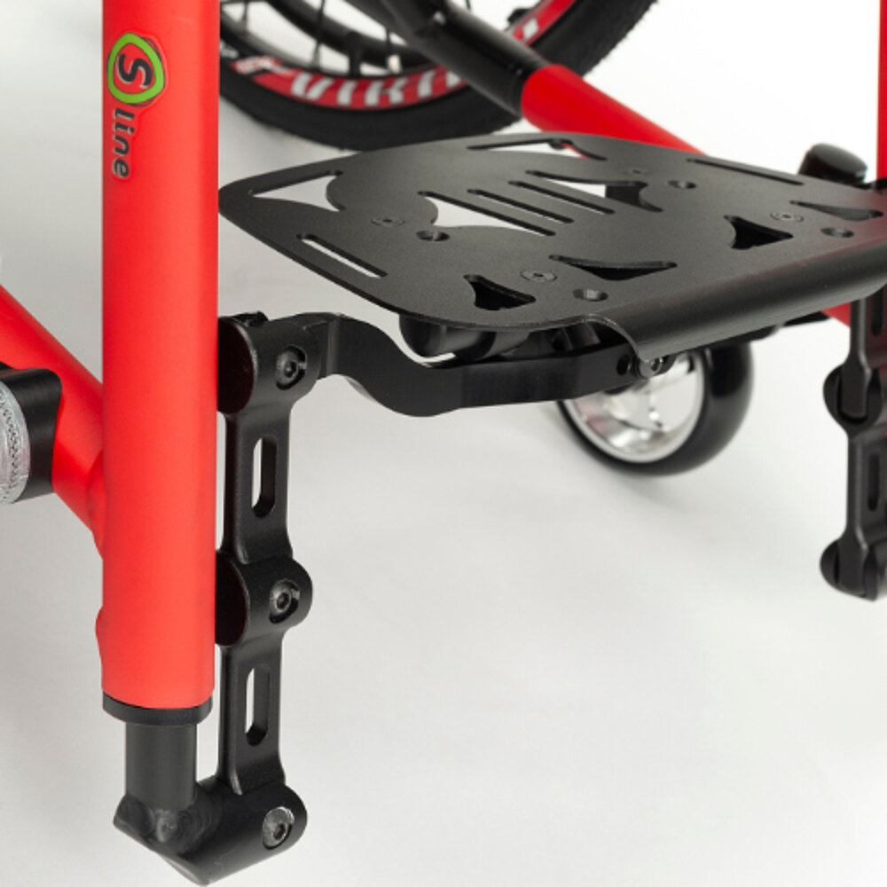 Un'altra caratteristica di TRIGO S è la pedana fissa e la piastra laterale regolabile in altezza. Il baricentro della carrozzina può essere regolato per soddisfare le esigenze individuali dell'utente. A seconda della regolazione, gran parte del peso dell'utente e della sedia può essere spostato in avanti o indietro.