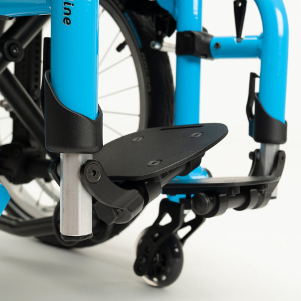 Una caratteristica straordinaria di TRIGO T sono le pedane regolabili e rimovibili. La carrozzina consente di regolare il baricentro in base alle esigenze individuali dell'utente. A seconda dell'impostazione, gran parte del peso dell'utente e della sedia può essere spostato in avanti o indietro.