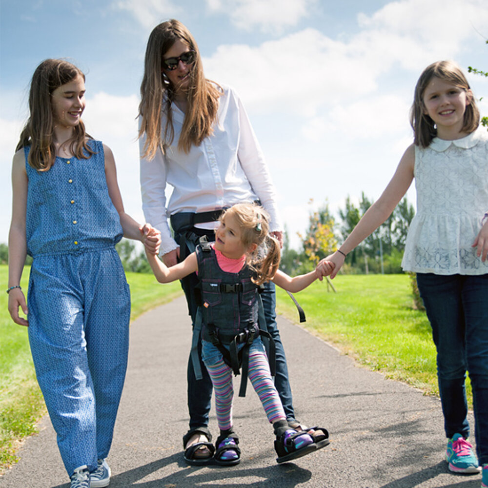 Meine Tochter mit Infantiler Zerebralparese hat dieses Hilfsmittel mit 6 Jahren bekommen. Seither gehen wir sogar Bergtouren mit ihr. Wir lassen die Fußschalen weg, da sie die Schritte selber machen kann. Es entlastet unsere Rücken enorm.